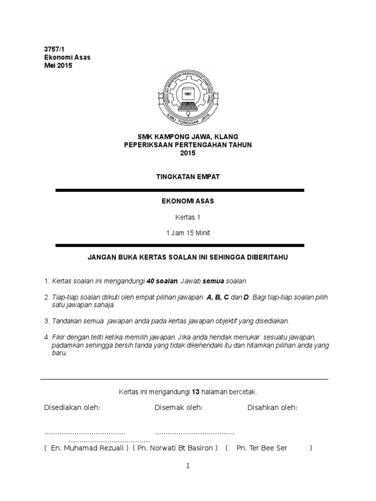 Peperiksaan Pertengahan Tahun Spm 2016 Ekonomi Asas Tingkatan 5 Kertas 1 Masa 1 Jam 15 Minit